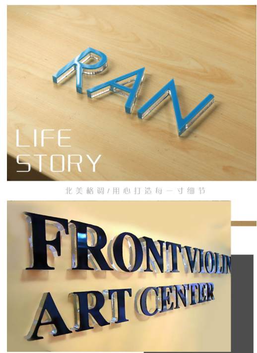 2.不銹鋼板烤漆:根據(jù)字形切割出對應(yīng)的不銹鋼板,然后烤漆上色,最后粘貼在水晶字表面